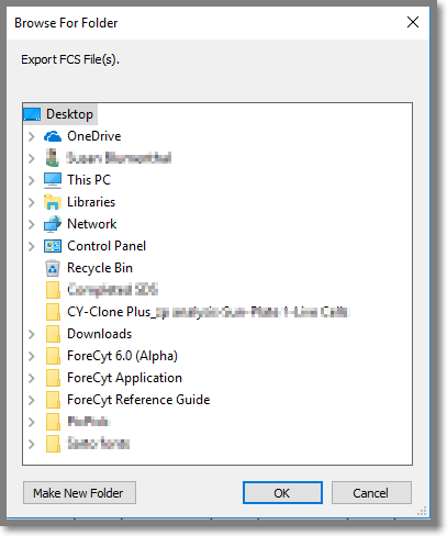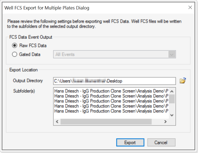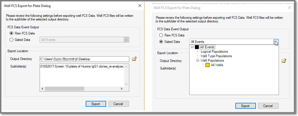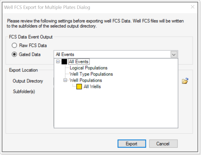 You can export well FCS data to a folder you select on your hard drive. As shown in the following screenshots there are two radio buttons for specifying output: Raw FCS Data and Gated Data. When you click Gated Data you can choose specific populations.