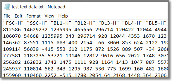 This function exports your data to a .txt (Note Pad) file. This will be a huge file if you have even a modestly complex experiment. The following screen shot is a tiny portion of the .txt output of an experiment. This format shows the actual values and can be imported into Excel or other applications for certain specialized analysis. The Export is for the entire plate. Each line is an event, however, there is no way to tell which well is associated with the event.