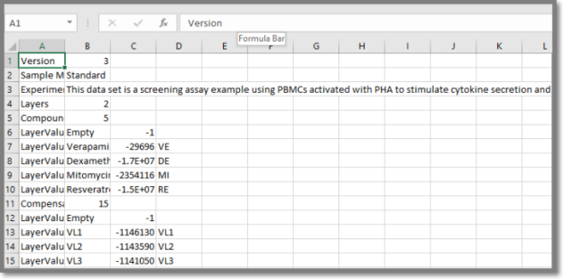 iQue Forecyt® provides the capability to export the protocol from each plate in CSV data as a CSV file (Comma Separated Values). No FSC data or analyses such as gates and plates are included. The output is an Excel file that looks similar to the following example.