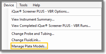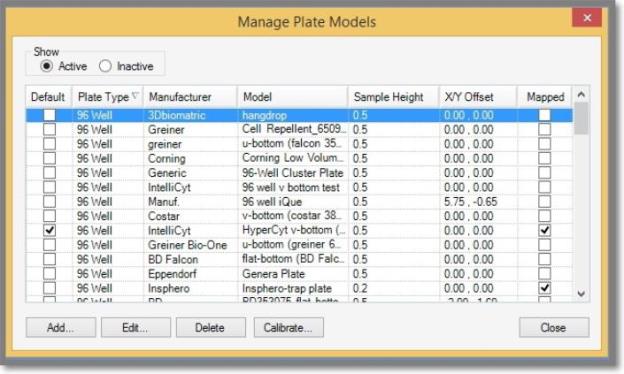 You may have a library of different plate models with different geometries, depths and characteristics. Manage Plate Models lists all plates used on an instrument. There are two default plate models listed, 96 and 384-well plates. Plate Models are also selected in Protocol.