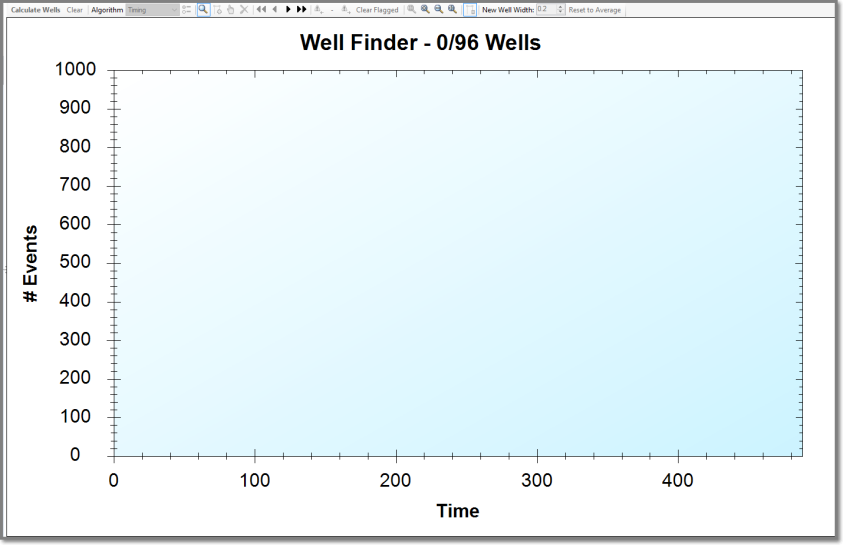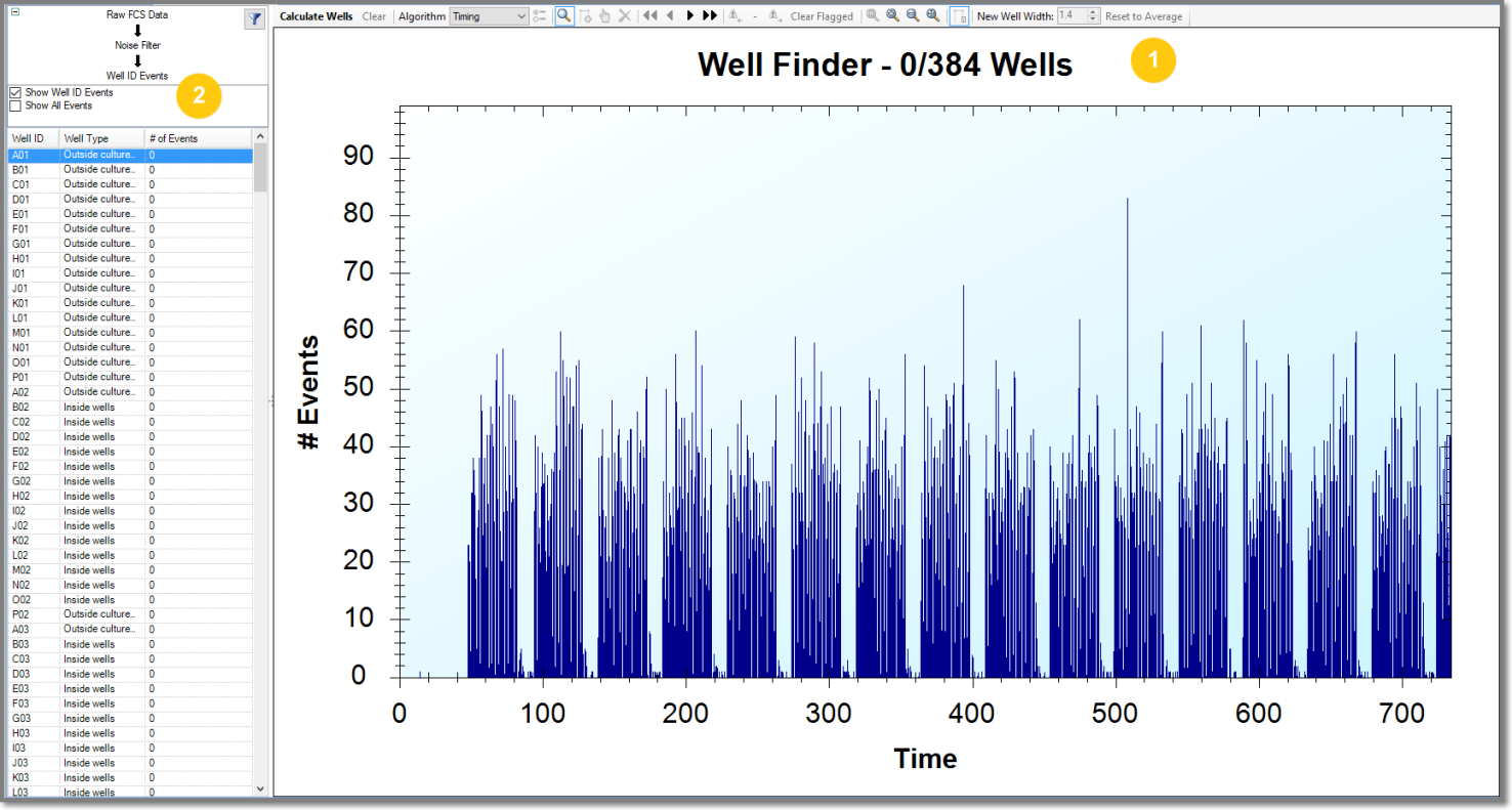 In the following screenshot example, you can see the peaks and valleys of the data stream and Well Finder (1) shows 0/96 Wells. The number of events (2) is 0 because no wells have been identified yet. Well Finder uses the information you specified in Design to make the determination that there are 96 wells.