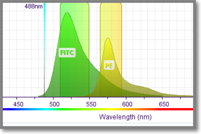 The following diagram illustrates one of the most common spillover situations: FITC into PE.