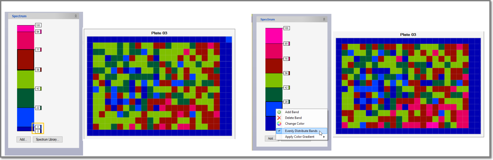 You can adjust the distribution of the bands by clicking on the number boxes and sliding the band. As shown in the following screenshot, the 4 and 0 bands are close together. Clicking Evenly Distribute Bands shifts them back to the default and changes the appearance of the Heat Map.