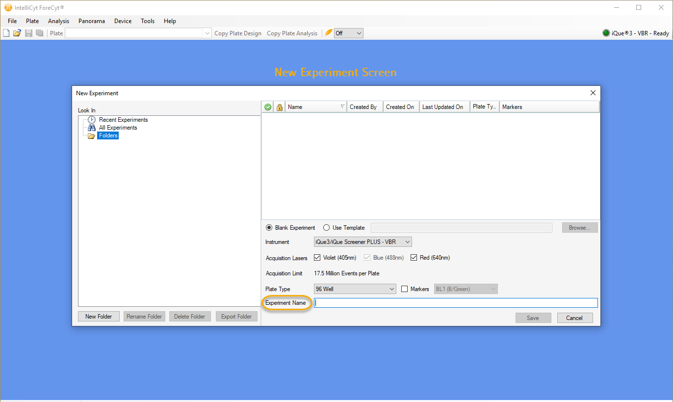 When you click on the New Experiment icon a window opens that lists all previous experiments (if any). At the bottom of the screen is a window where you will name the experiment and click Save.